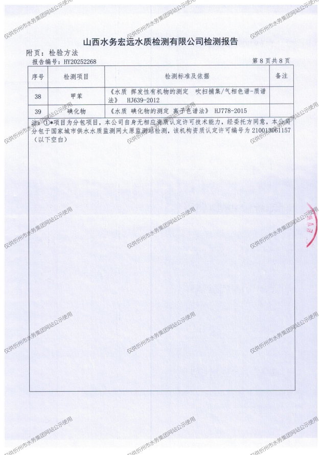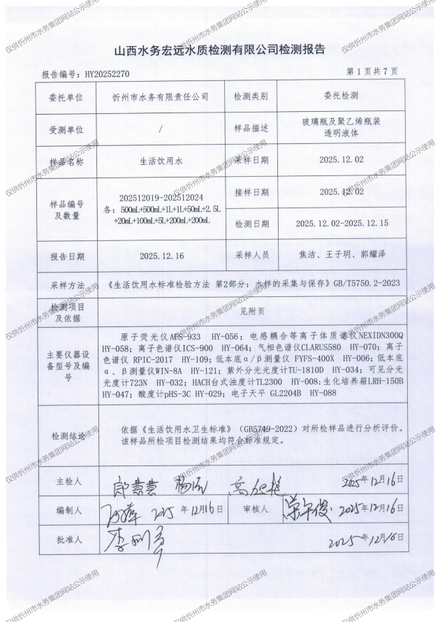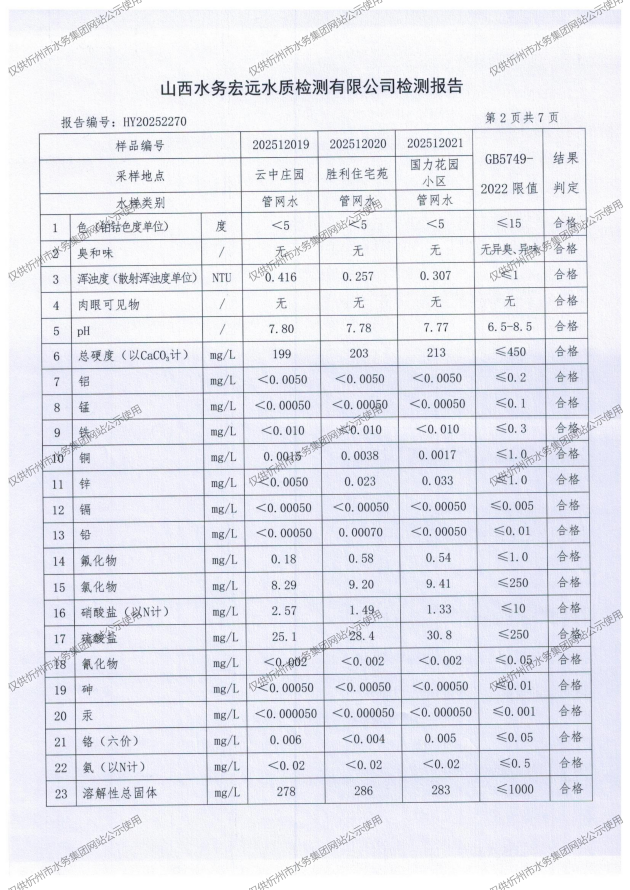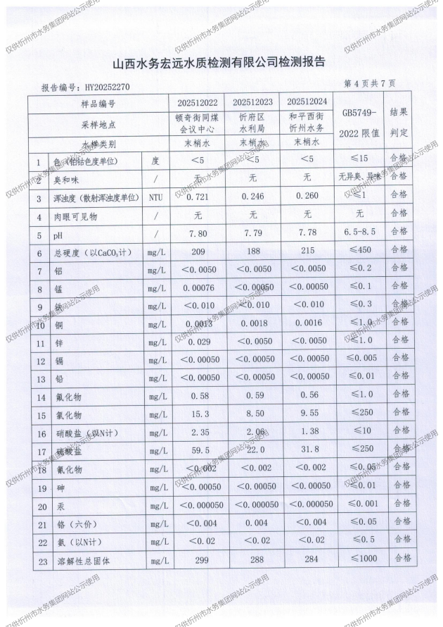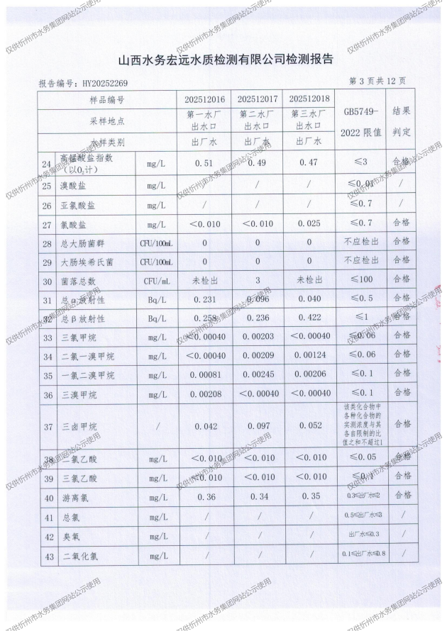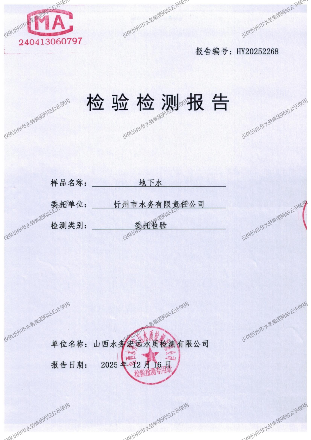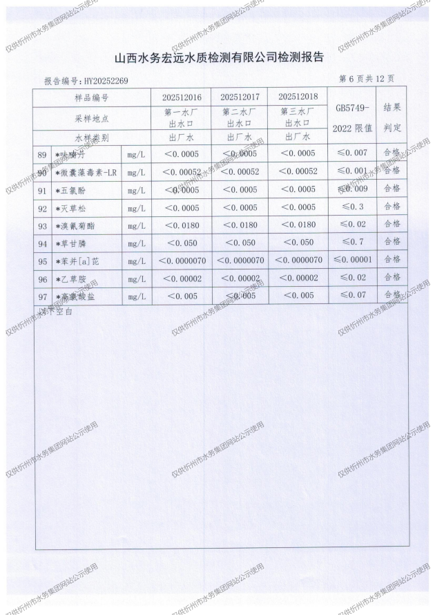 忻州城區(qū)公共供水水源水、出廠水、管網(wǎng)水、管網(wǎng)末梢水2025年12月份水質(zhì)信息公示